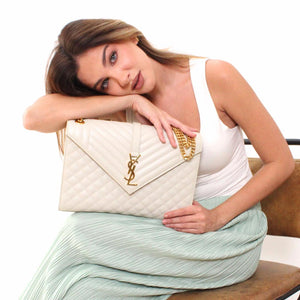Su elegante diseño inspirado en un sobre presenta tres patrones de costura únicos: vertical, chevrón y diamante, que nos encantan absolutamente.